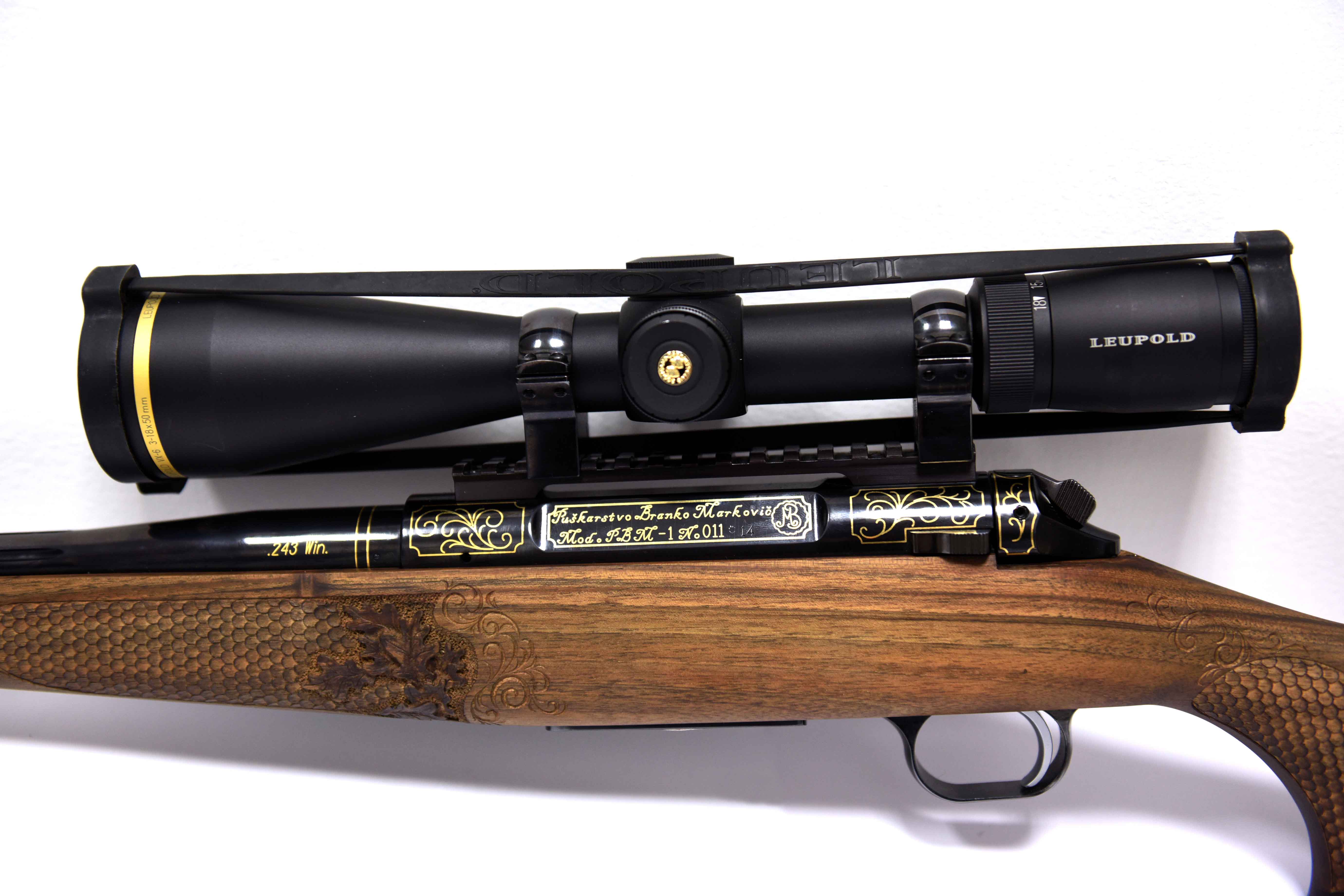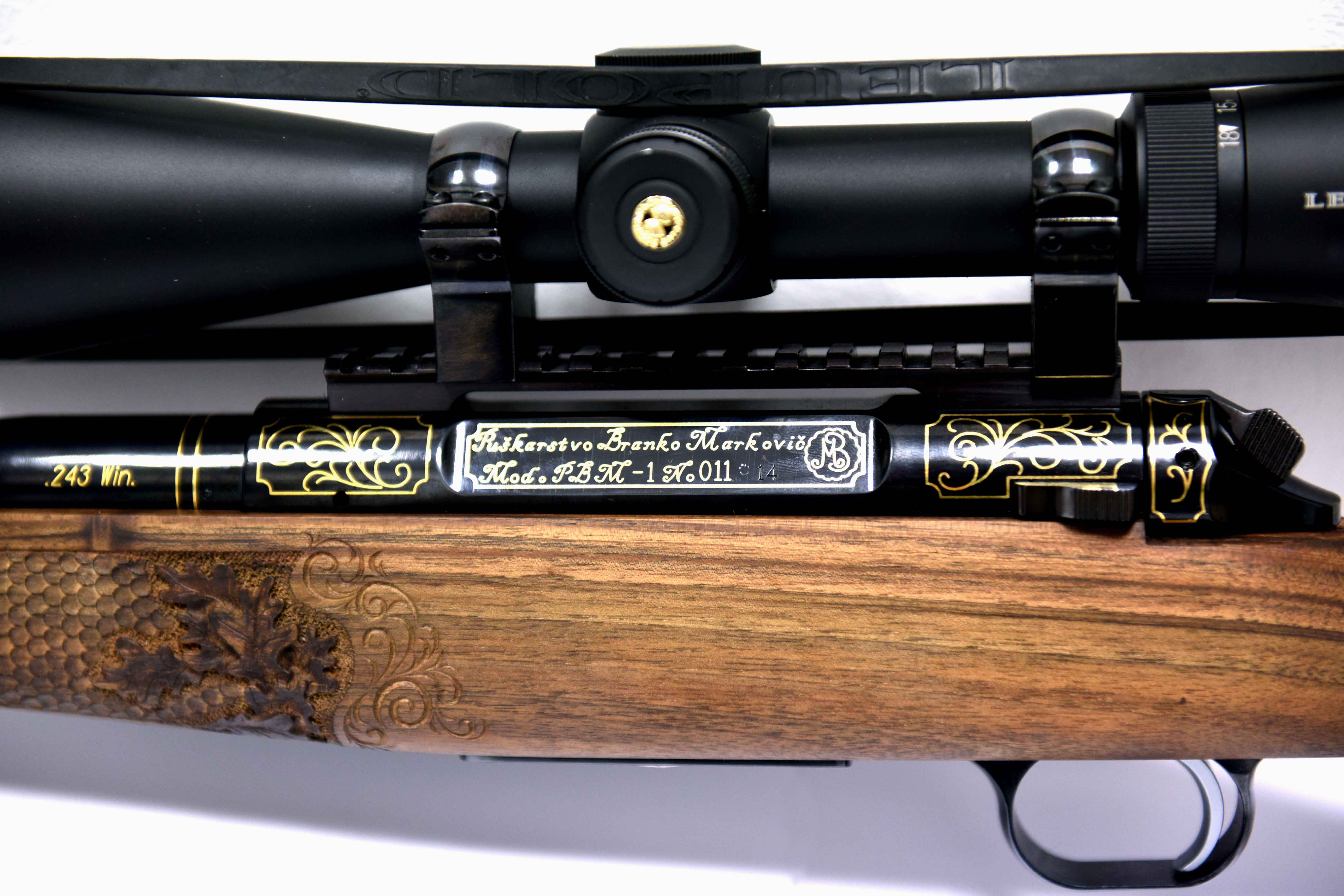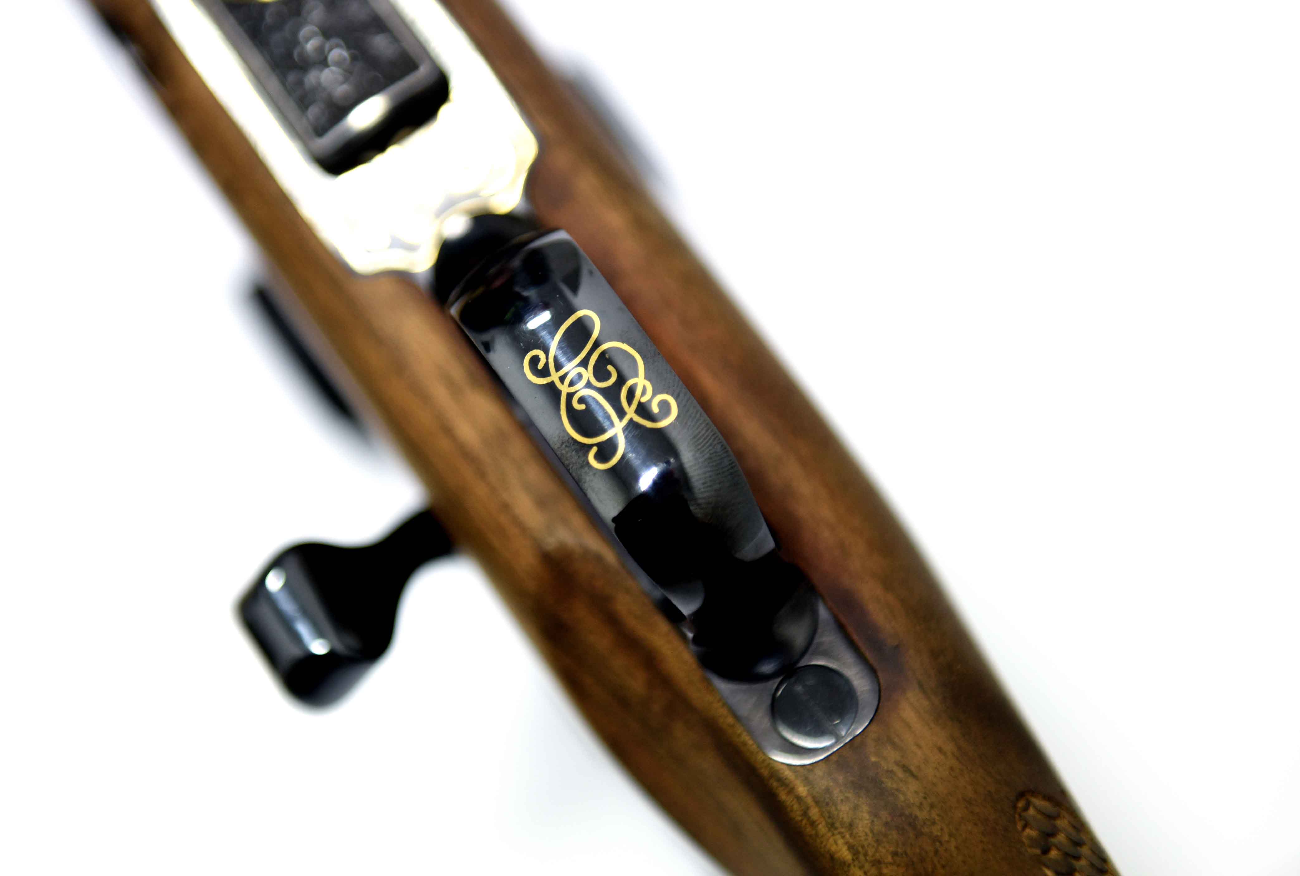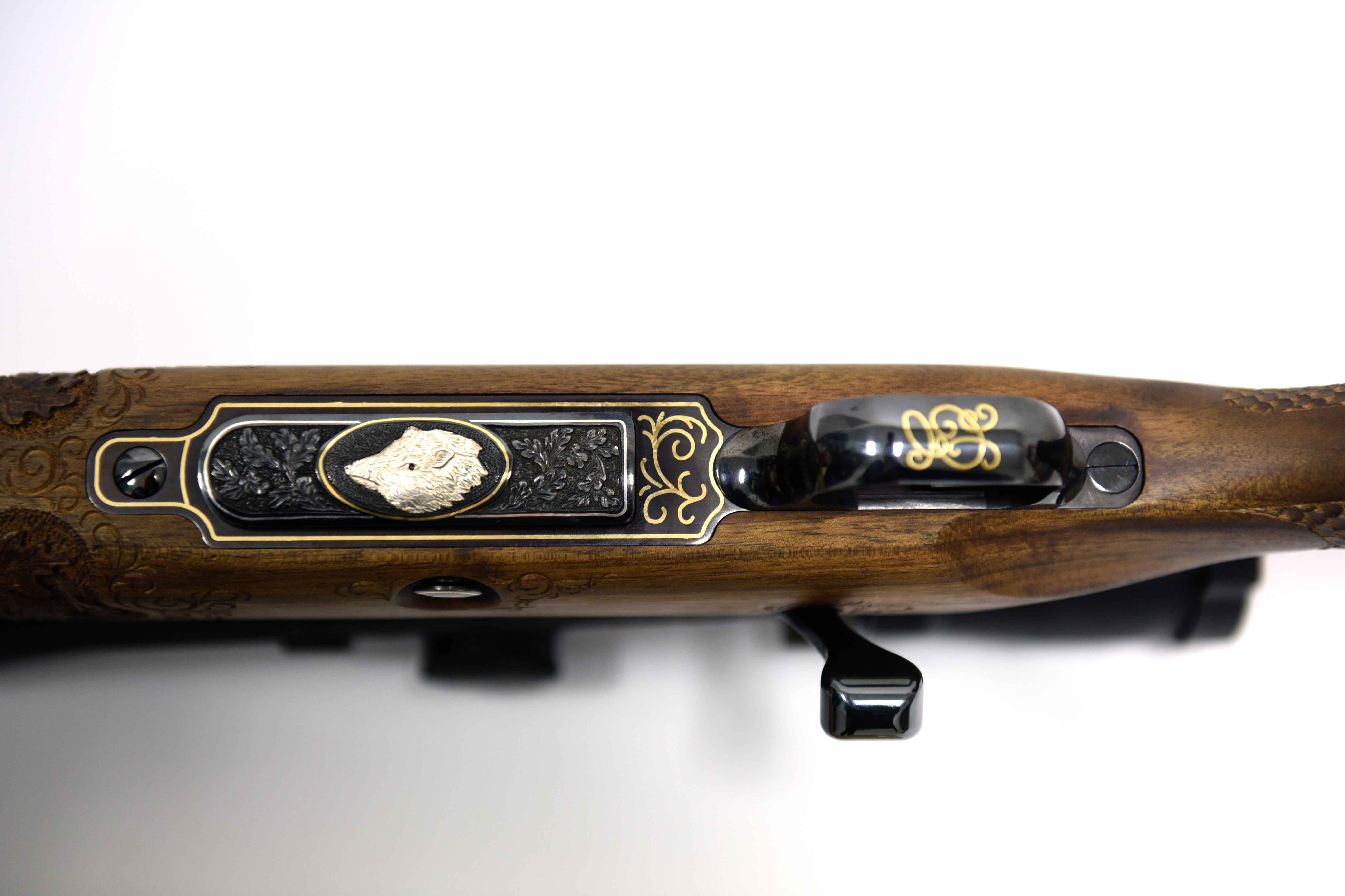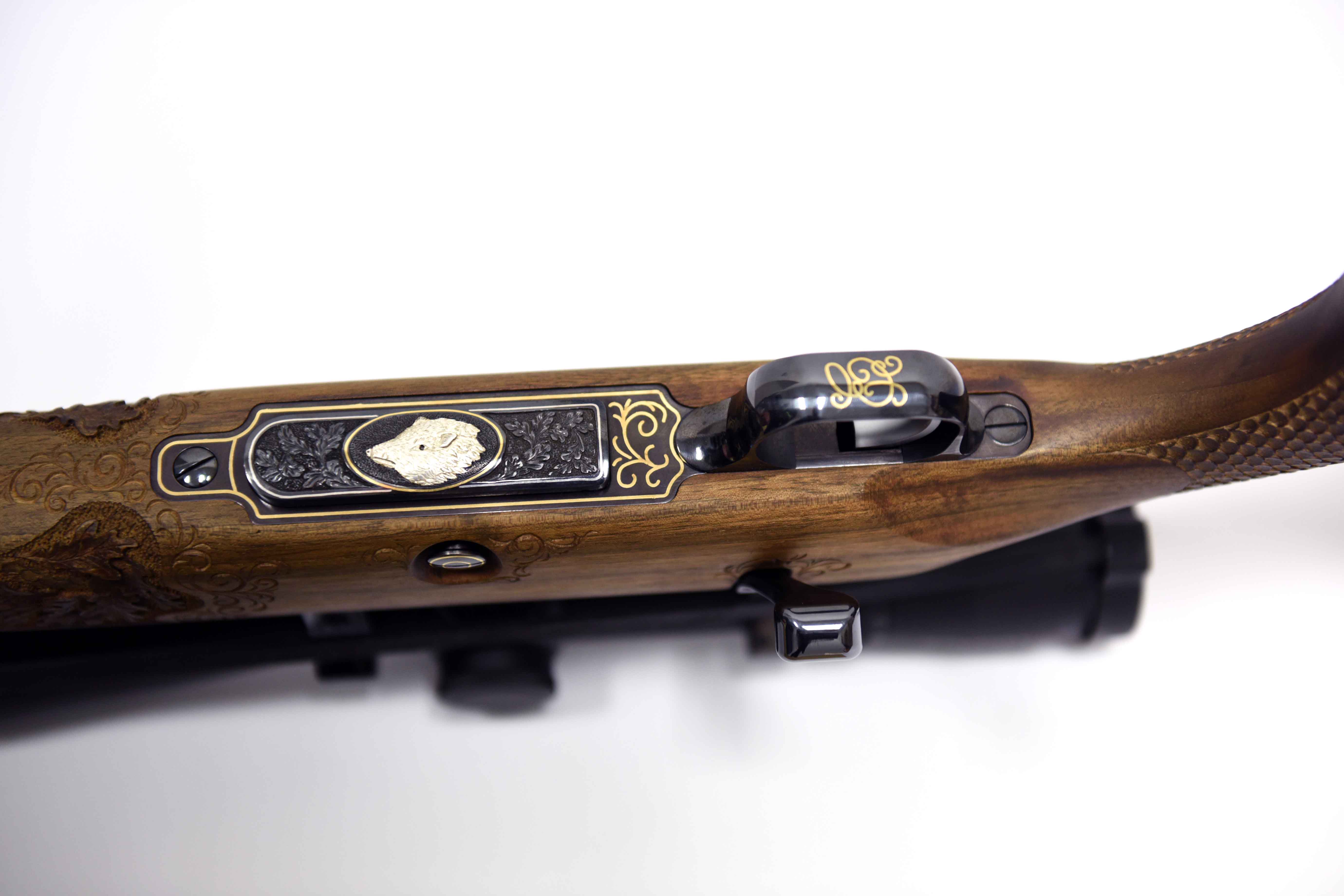 Die Jagdwaffe zeichnet sich unter anderem durch einzigartige vergoldete Gravur (24kt) und Gewehrkolbenverzierung aus.Kaliber: .243 Win.