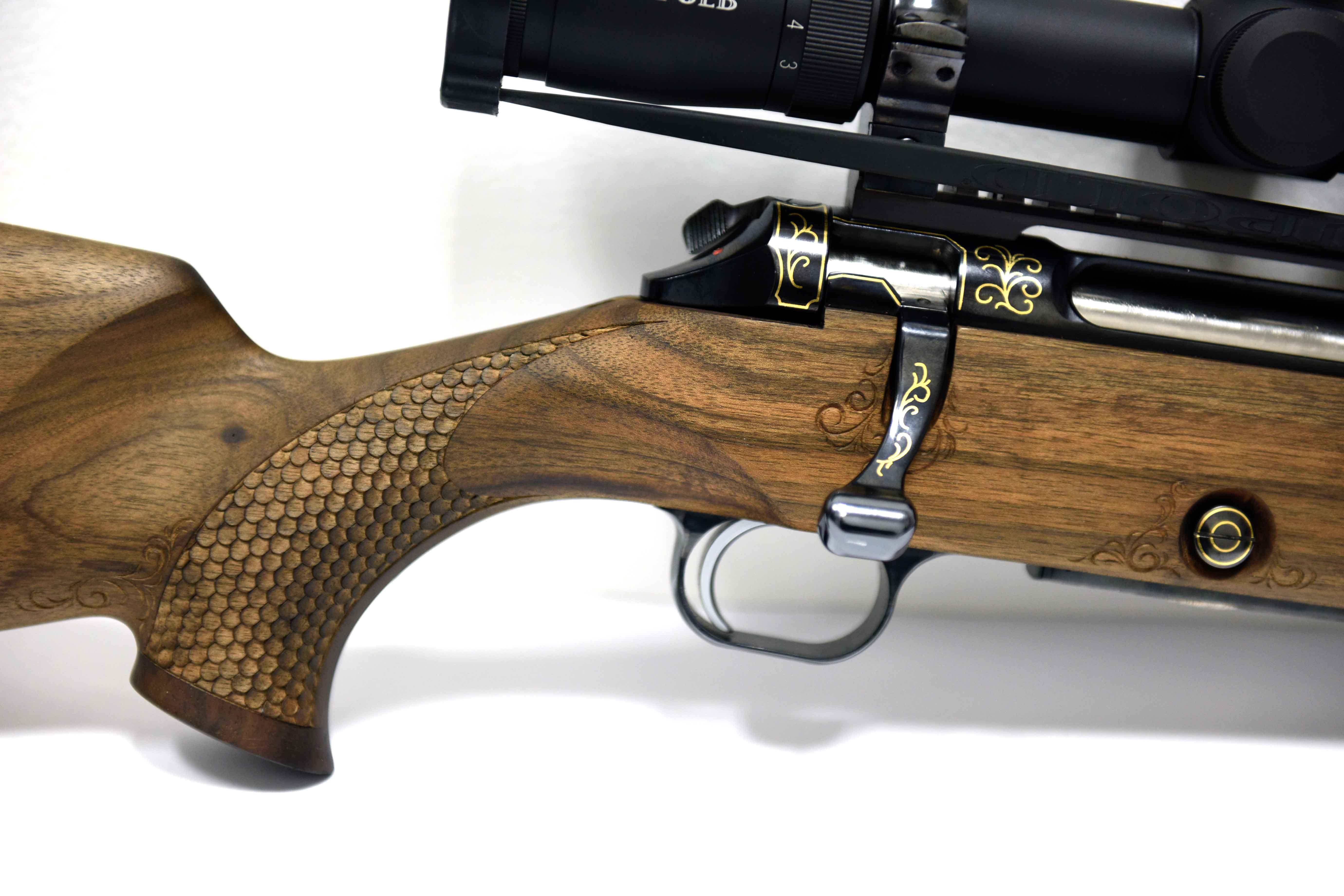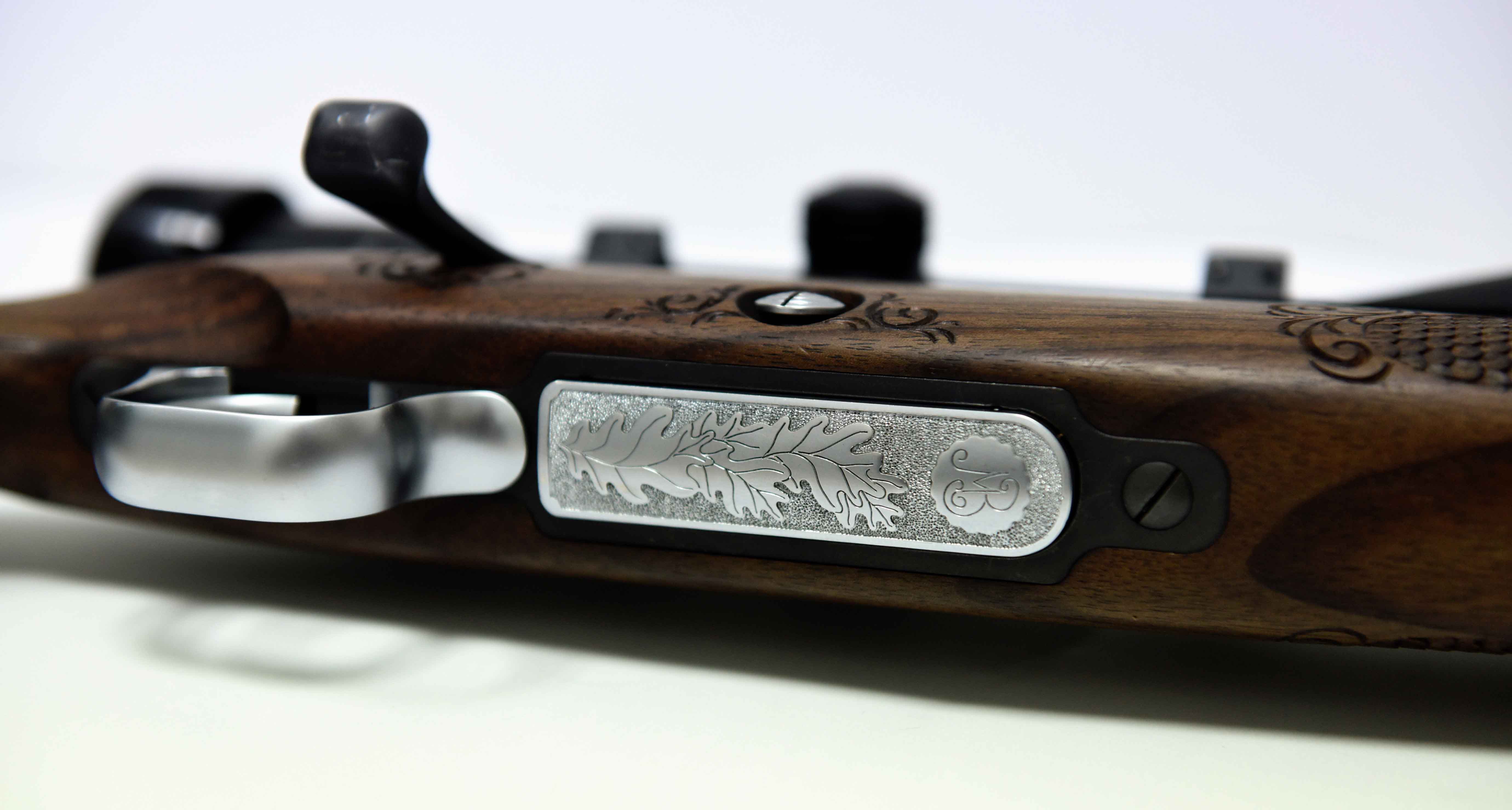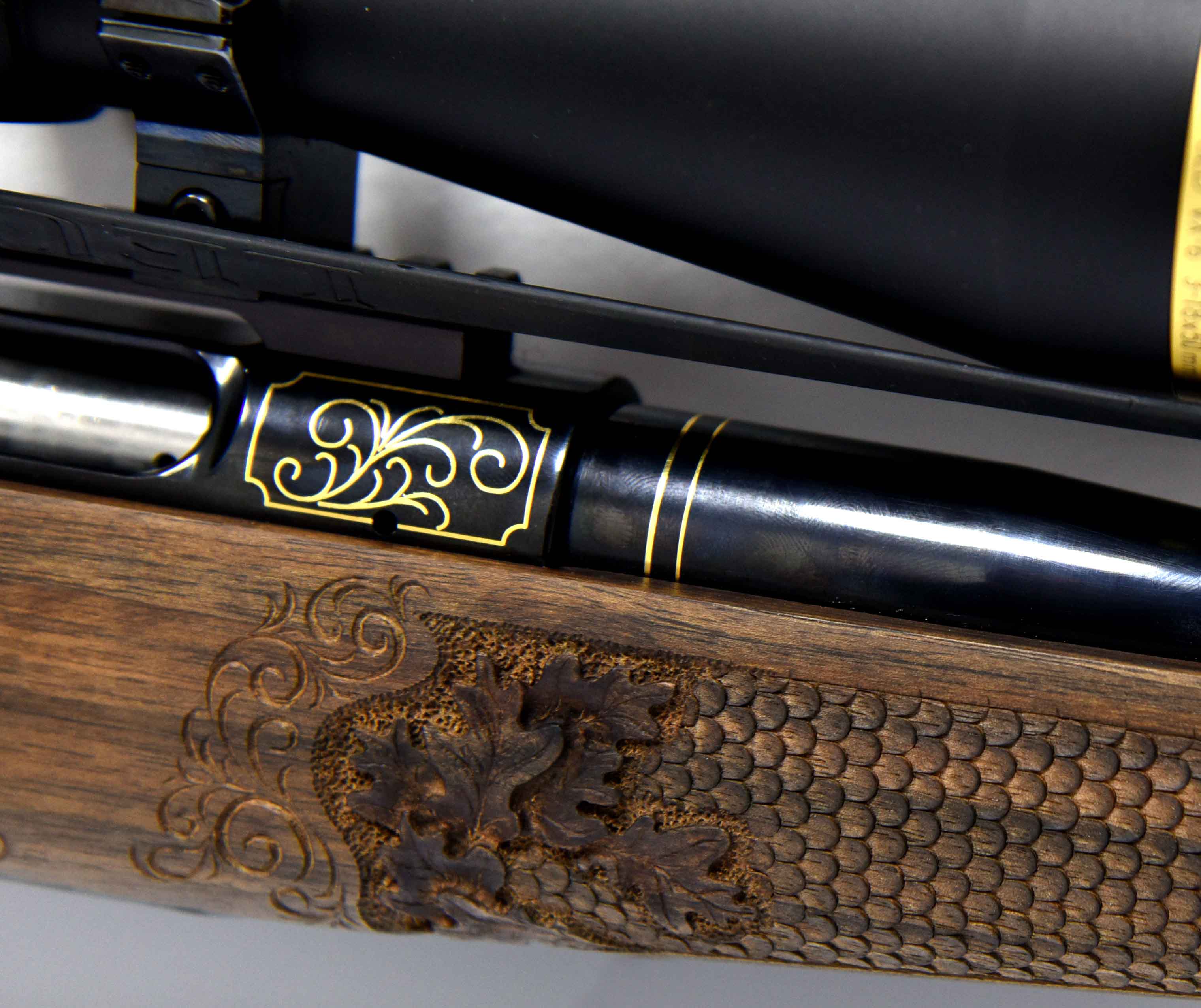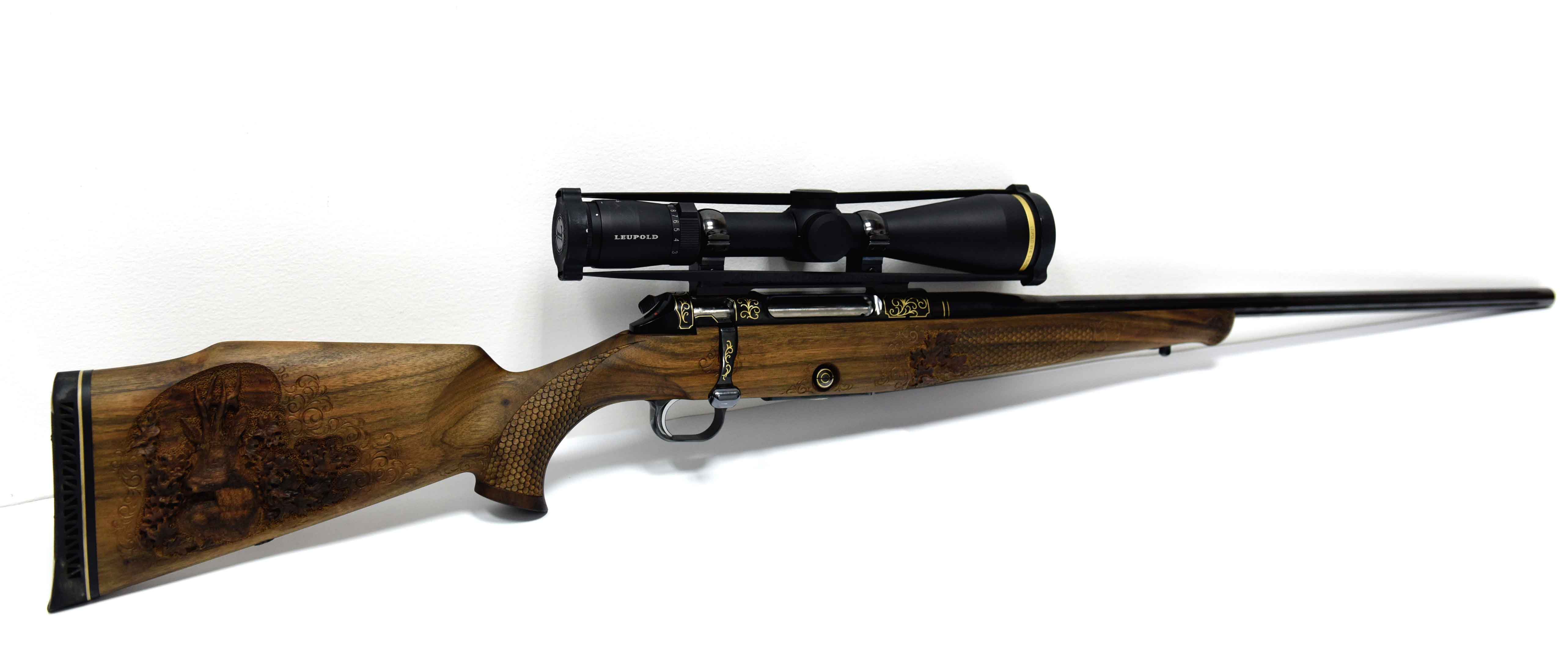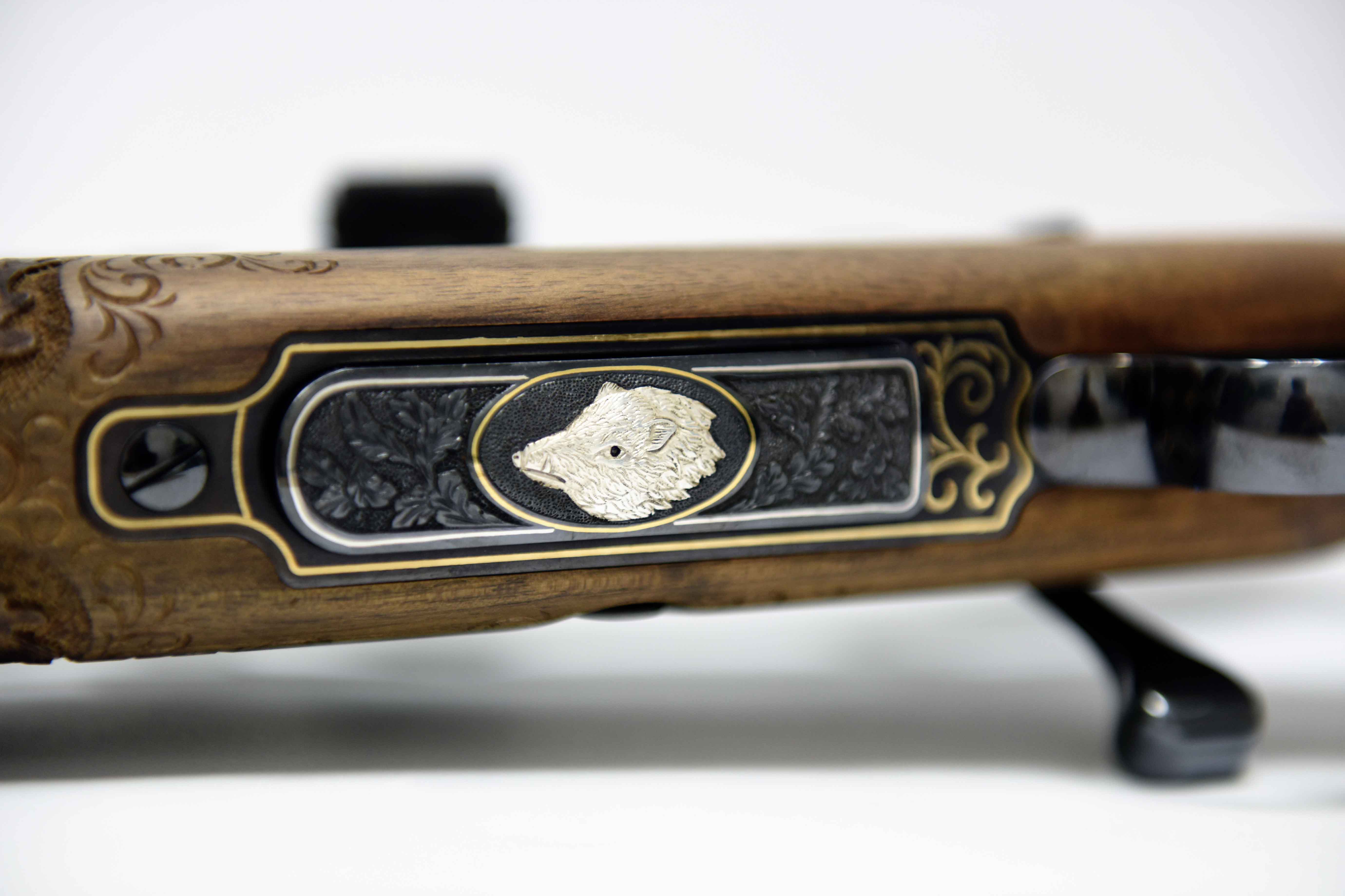 Die Jagdwaffe zeichnet sich unter anderem durch Echenblatt-Gravur und Gewehrkolbenverzierung aus.Kaliber: .234 Win.