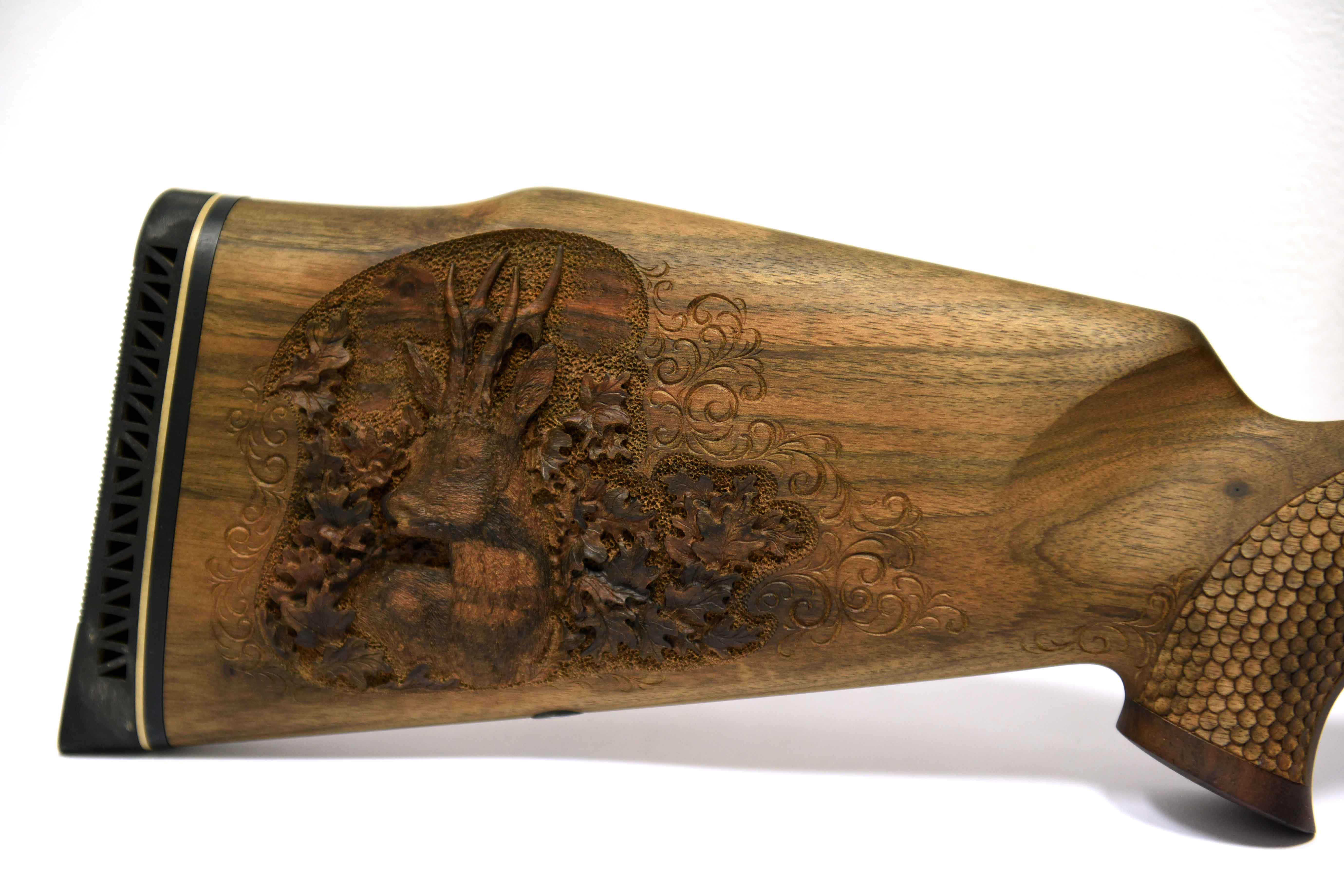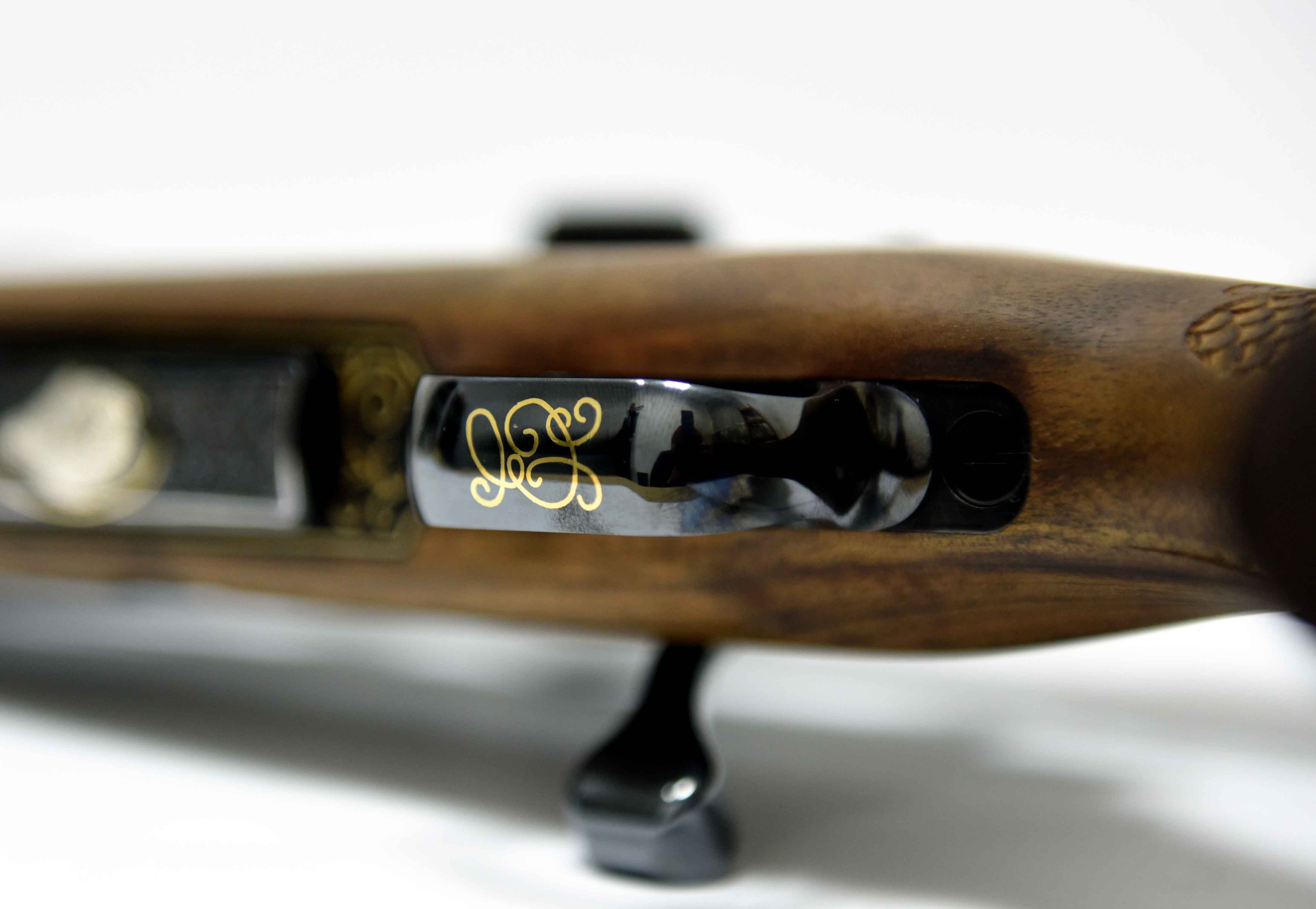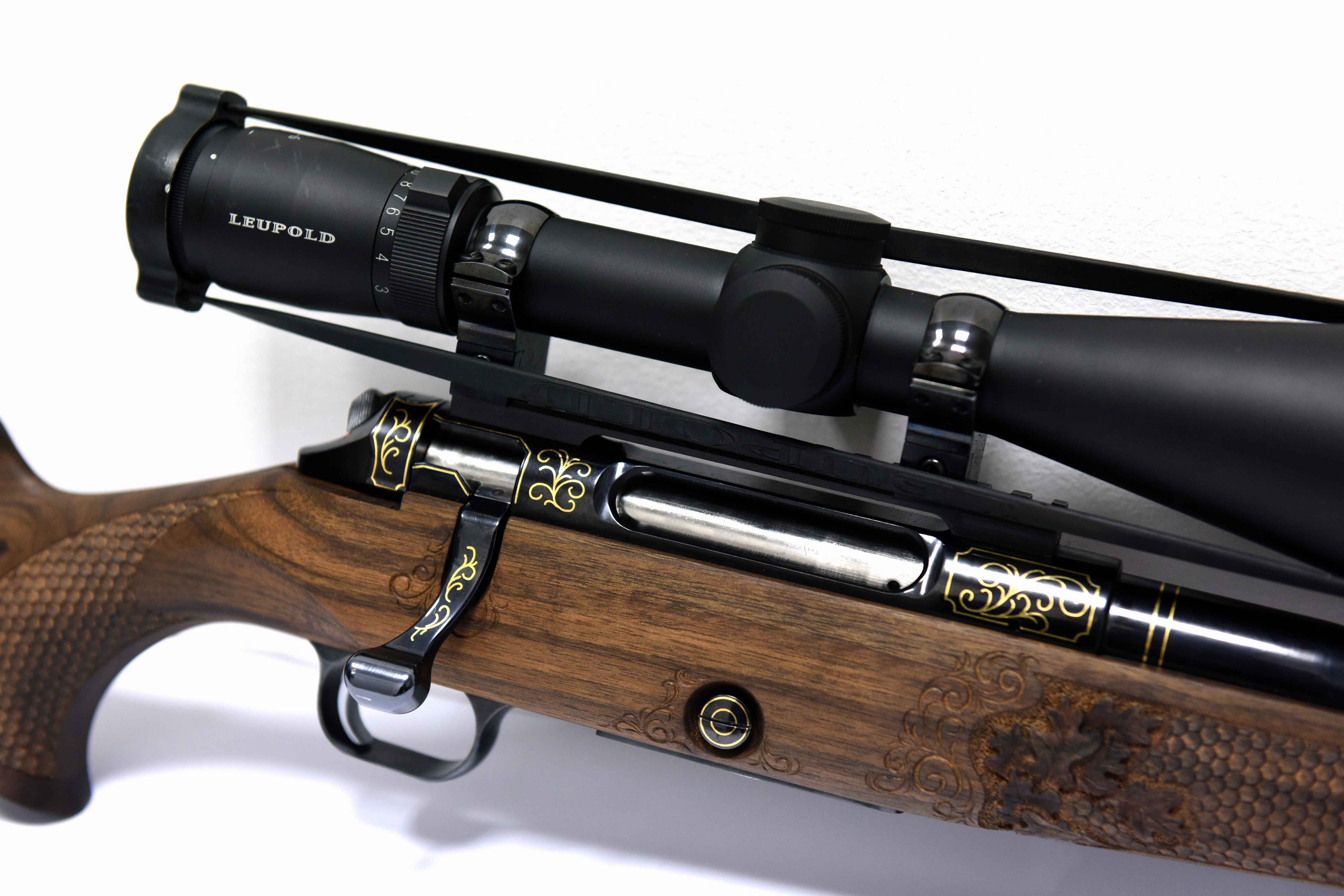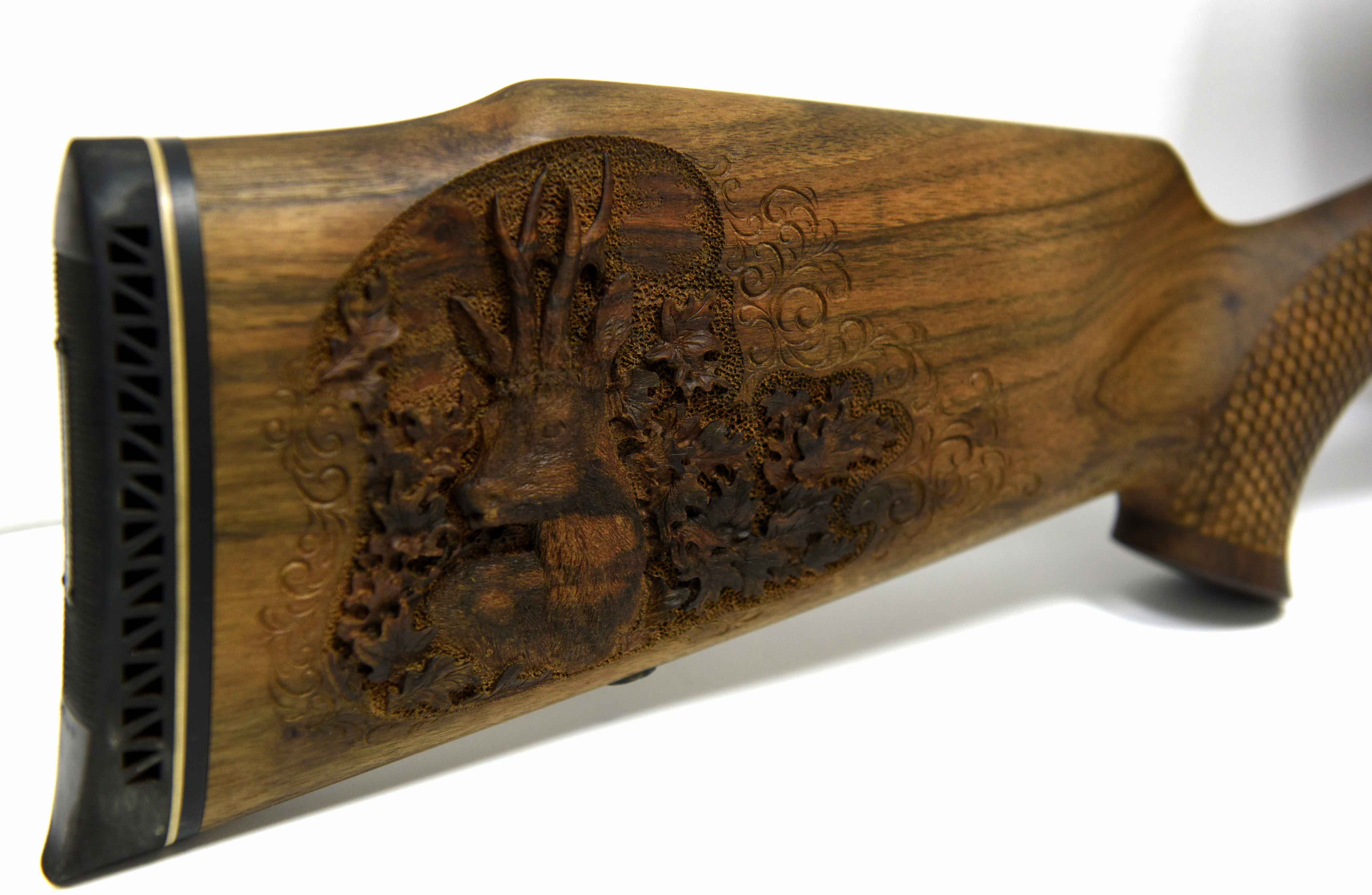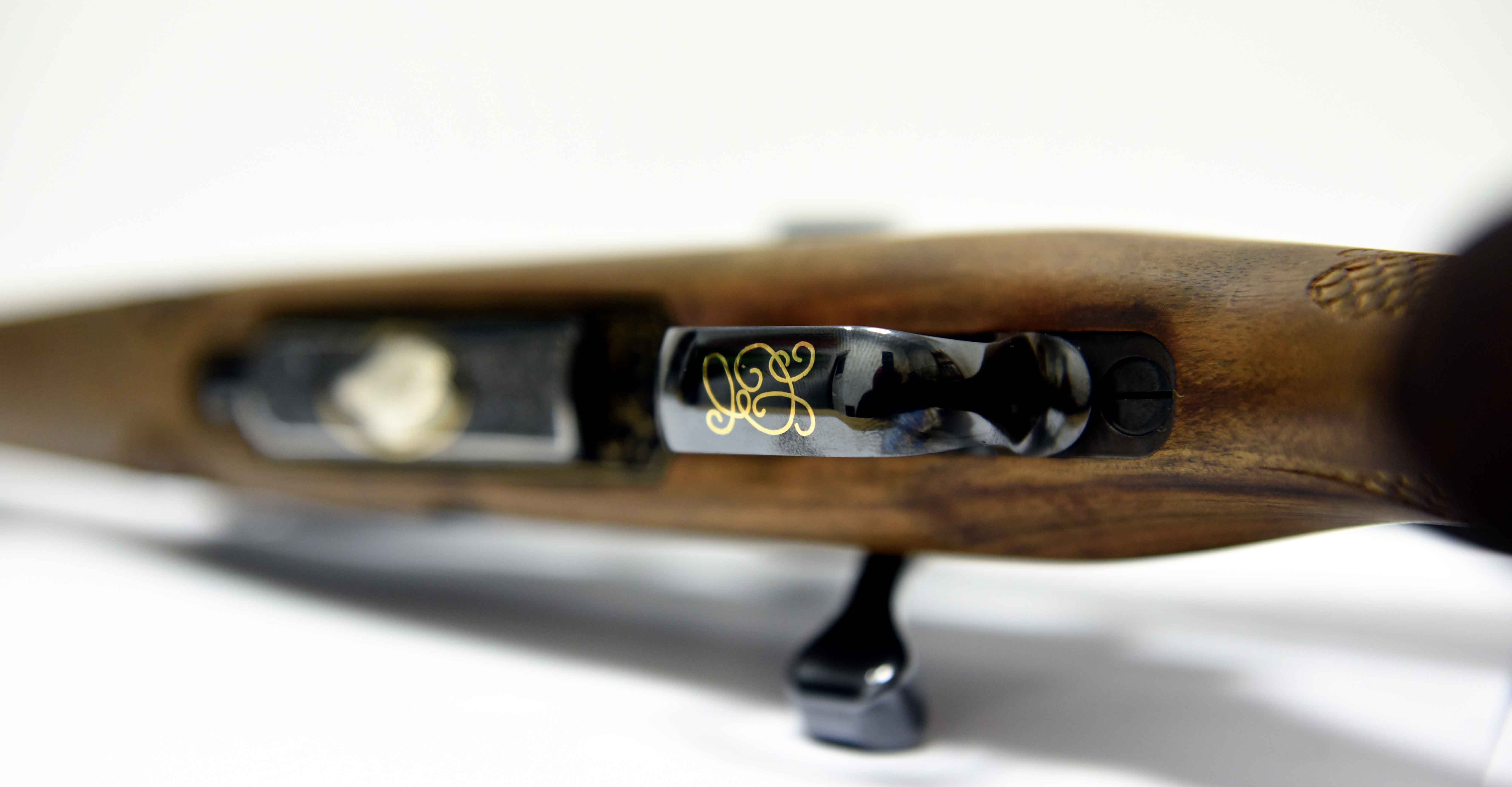 Die Jagdwaffe zeichnet sich unter anderem durch Echenblatt-Gravur und Gewehrkolbenverzierung aus.Kaliber: .234 Win.