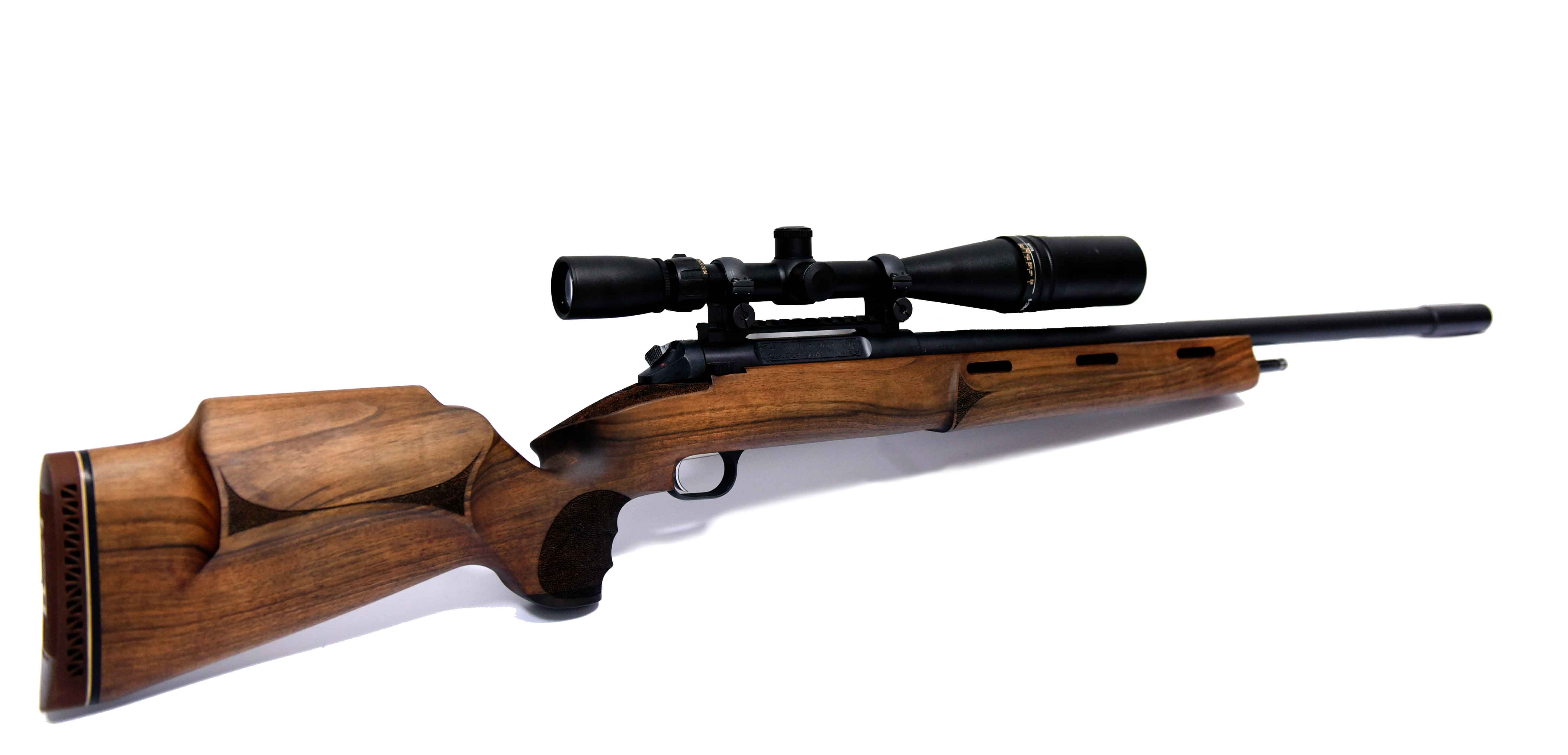 Jagdrepetierbüchse mit gezeichnetem Lauf. Es handelt sich um ein Varmint Kanalirte Modell mit der Ø 19 Mündung der Spitzenfirma Lothar Walther. Das Magazin fasst 3 Patronen.